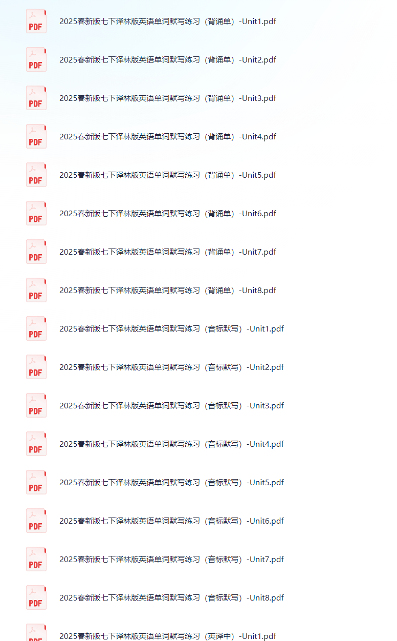 译林《初中英语单词默写表》下册 栏目:初中资料 作者:柠檬酸酸 时间:2025-01-27 14:48:58 译林《初中英语单词默写表》下册下载地址:https://pan.quark.cn/s/aeda87b0dfd5